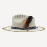 100% handcrafted hat made of wool with flat design. With application of brown fabric, metal skull and handwritten quote, rooster, turkey and coquena feathers.