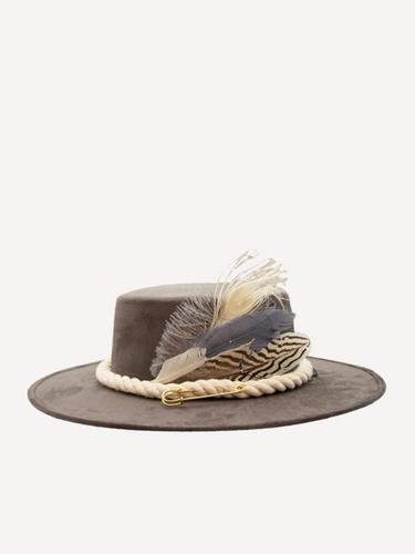A profound desire for union and intimacy, a symbol that calls for you to wake your vitality, wisdom, and passion for life. 100% handmade white suede fedora. With cotton rope band, embroidery, white peacock, ostrich, goose, and silver pheasant's feathers, and a golden safety pin.