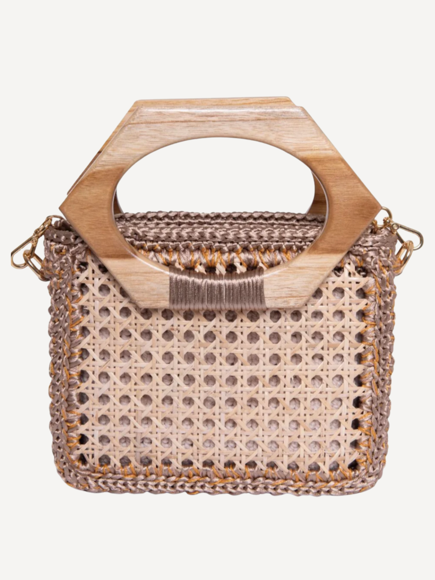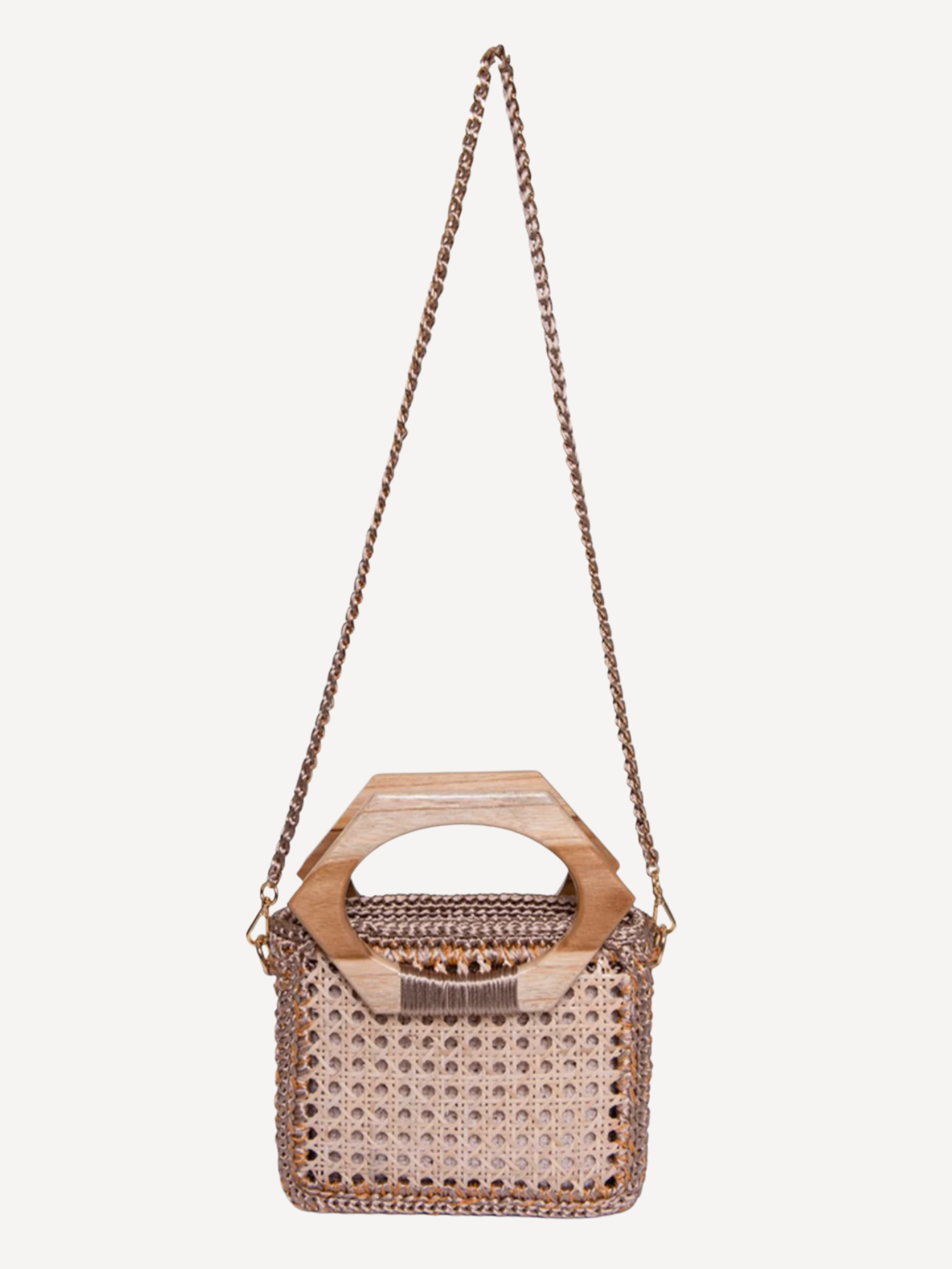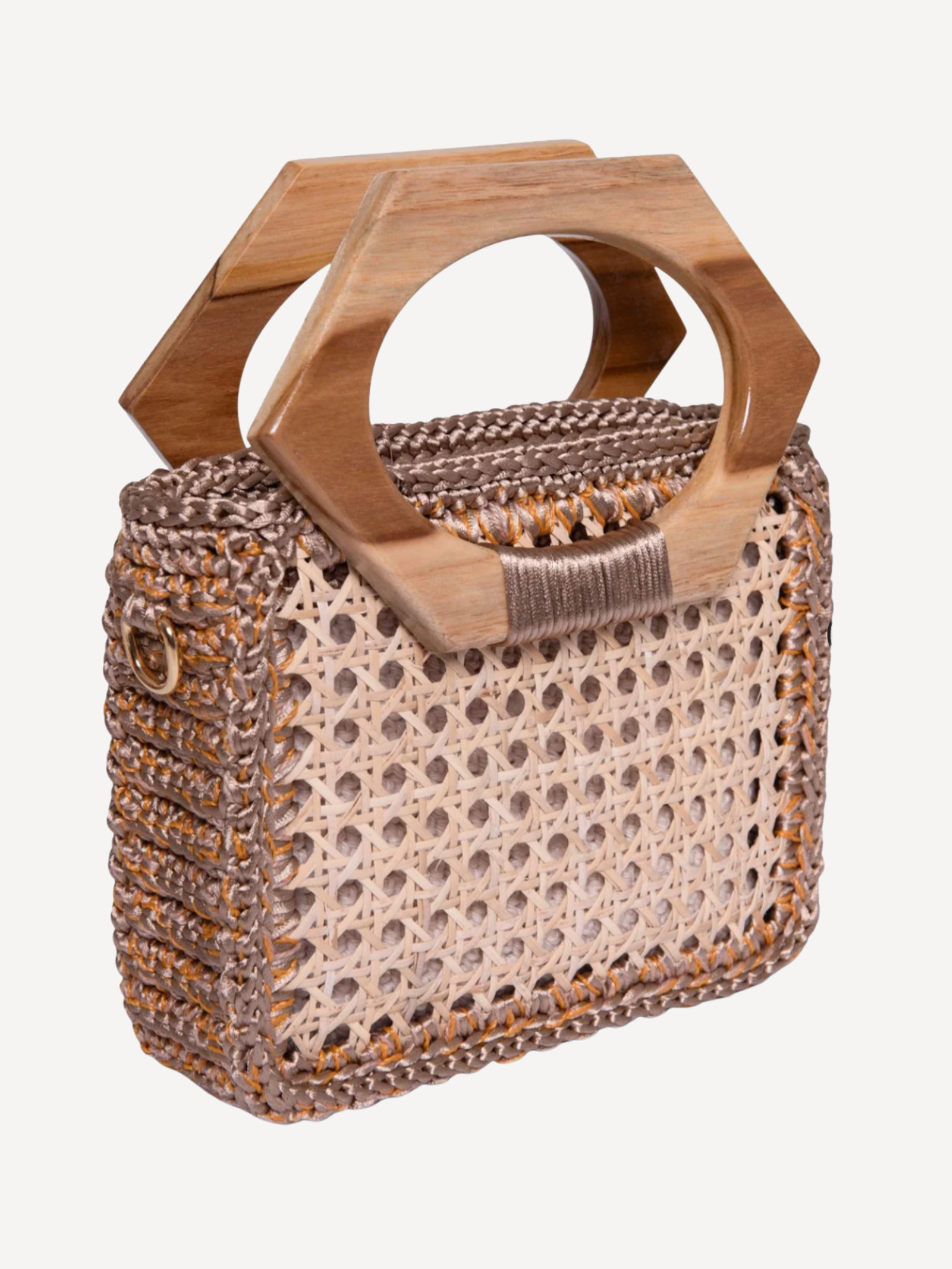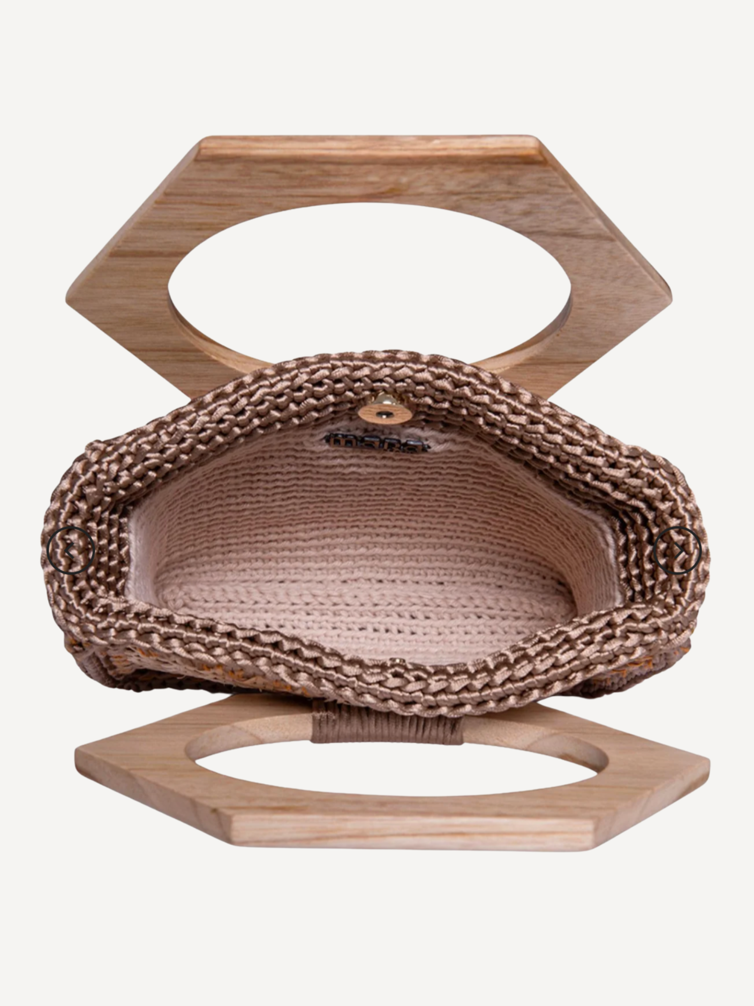 Handcrafted with over 1,800 intricate stitches, the Muria is a standout piece with a unique design and a natural wood handle. It features a vegetal fiber panel that adds texture and an organic feel. The bag includes two strap options: the wooden handle for a chic, structured look, and a removable chain strap woven with crochet details for crossbody or shoulder wear. Fully lined with handcrafted cotton.