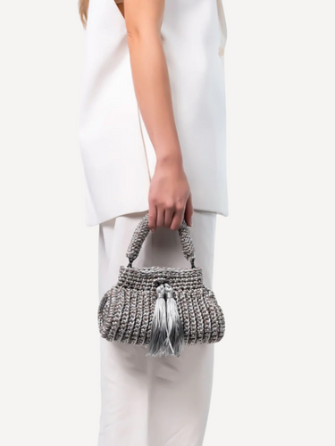 Handcrafted with over 1,300 intricate stitches. Elevates any ensemble. Its rounded silhouette features a rich interplay of shiny and matte textures creating a refined finish. Wear it as a clutch or use the chain strap for a chic crossbody style.
