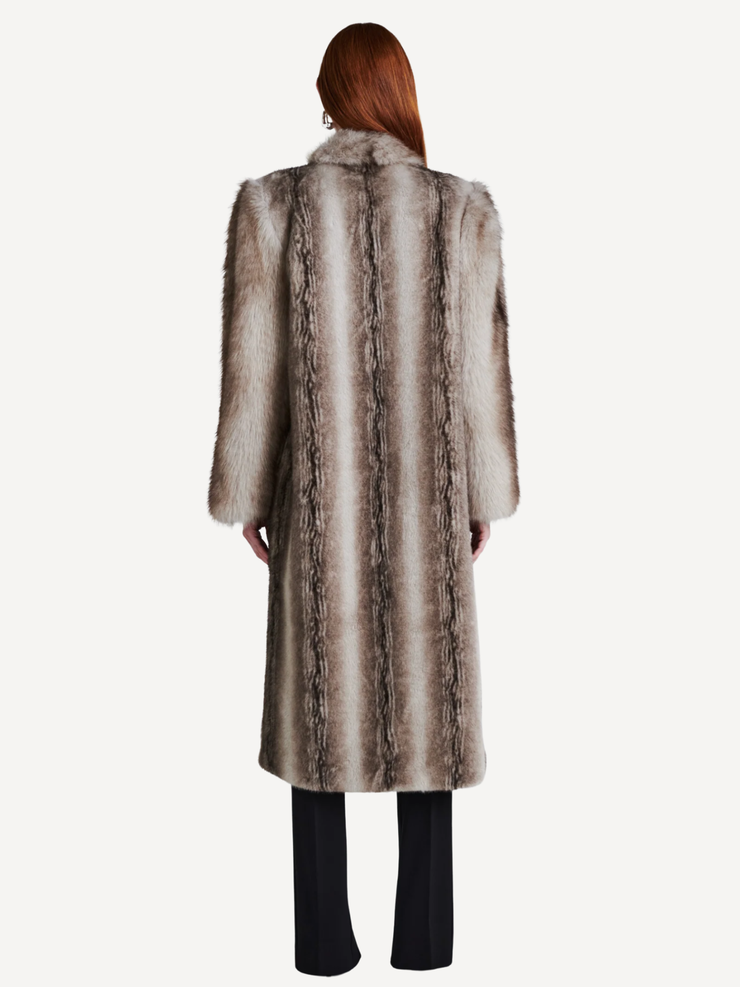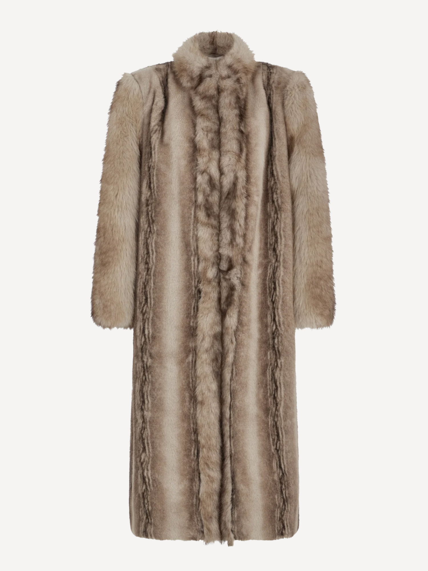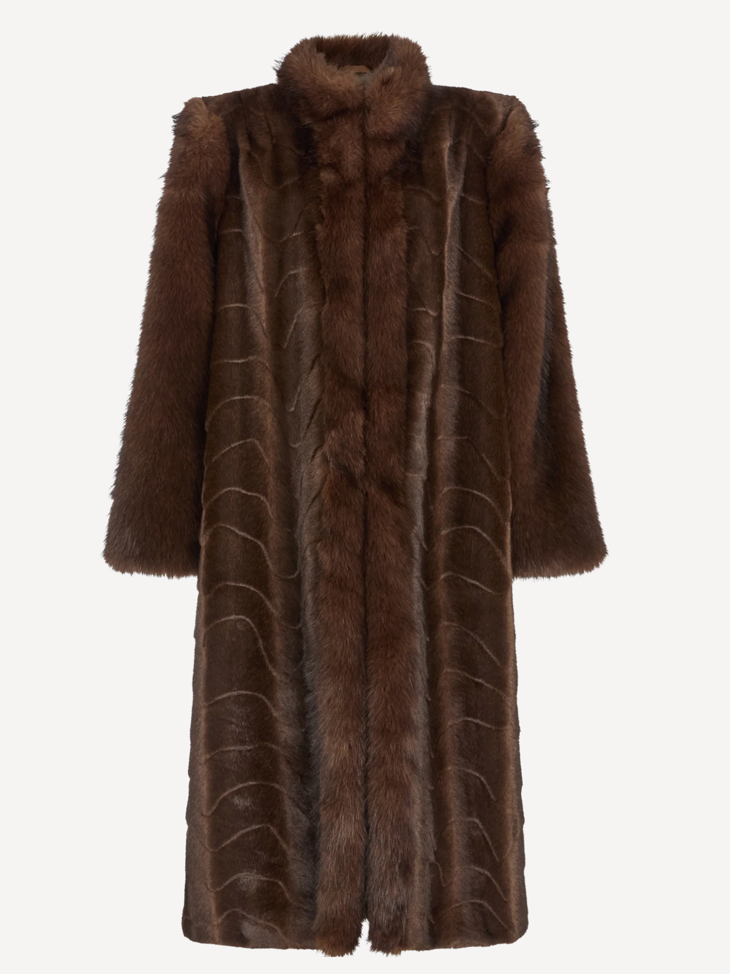 An opulent mid-length faux fur coat combining two types of fur. It features a stand collar and princess sleeves leaning into the 90’s power shoulders silhouette. Side seam pockets and front hook fastenings make for a sleek finish.