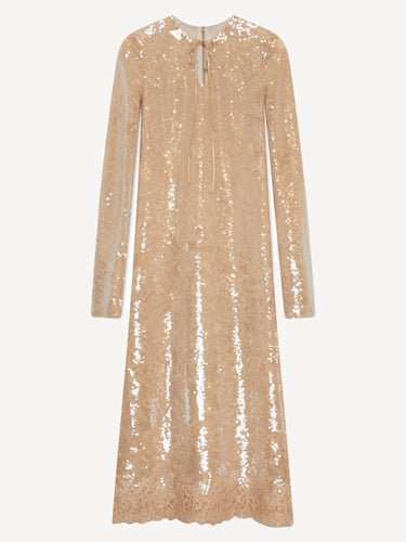 The Natalina dress is shimmering in sequins with a long sleeve and lace trim along bottom.