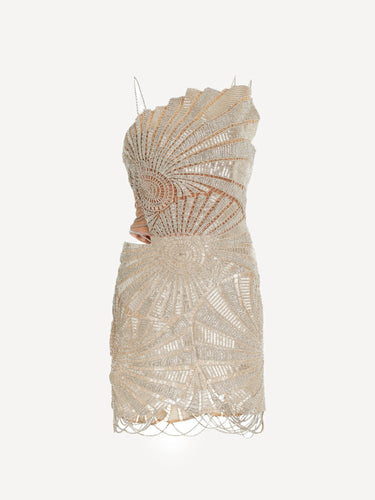 The Penelope Crystal Shell Dress in Silver features shell motif and is the perfect show stopping mini dress.