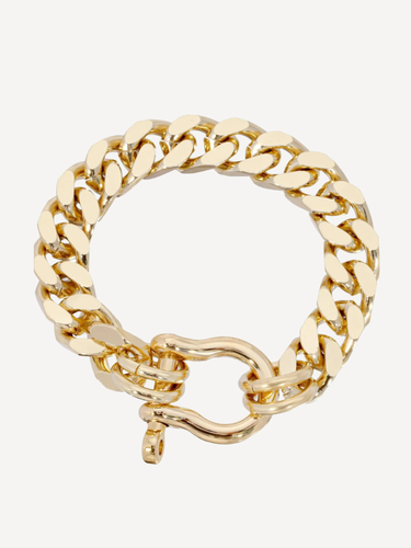 The Roxy bracelet is made from thick squared off recycled brass cuban link chain, fastened with a with horseshoe clasp. Finishes available: 14k Gold plated or Rhodium-Silver plated.