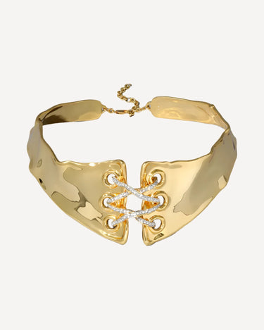 Creating the illusion of a corset, this limited edition molten 14k gold plated collar necklace is crafted using a custom designed mold inspired by corsetry and the 70's punk bondage aesthetic. Pavé crystal accented lacing gives visual emotional tension, as it weaves together the rippled metal around the neck.