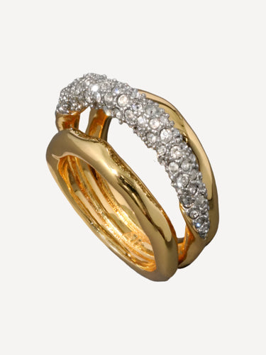 Bands of high-shine silver tone plated brass and brilliant micro pavé crystal give the illusion of stacked rings with negative space on this sculptural orbiting ring.