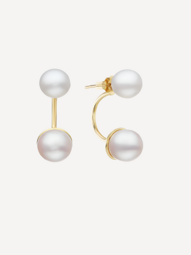 Double the pearls, double the fun. Two rare and organic white 6mm & 7mm Japanese Akoya pearls, on 100% reclaimed and recycled solid 14k gold arches.