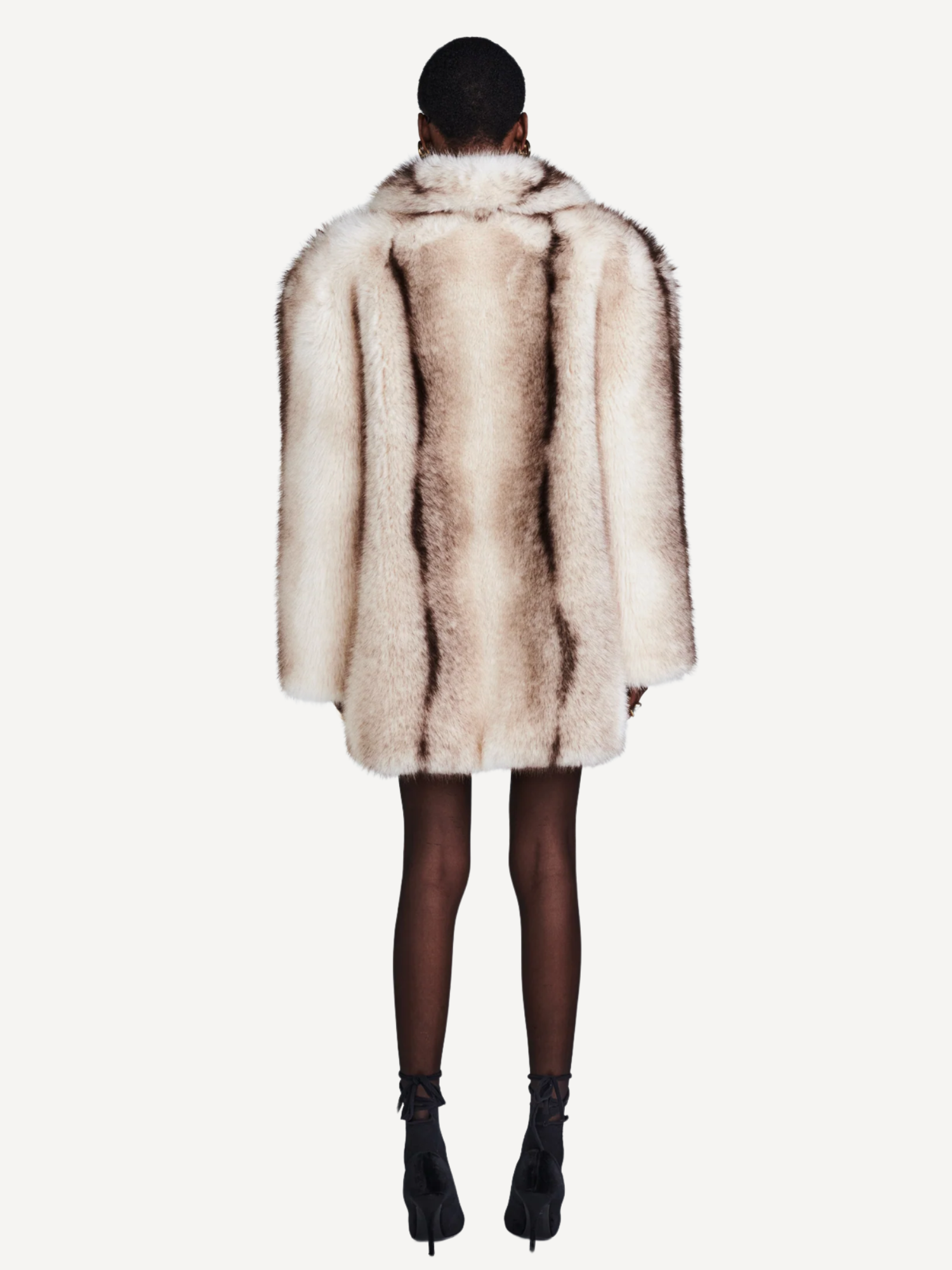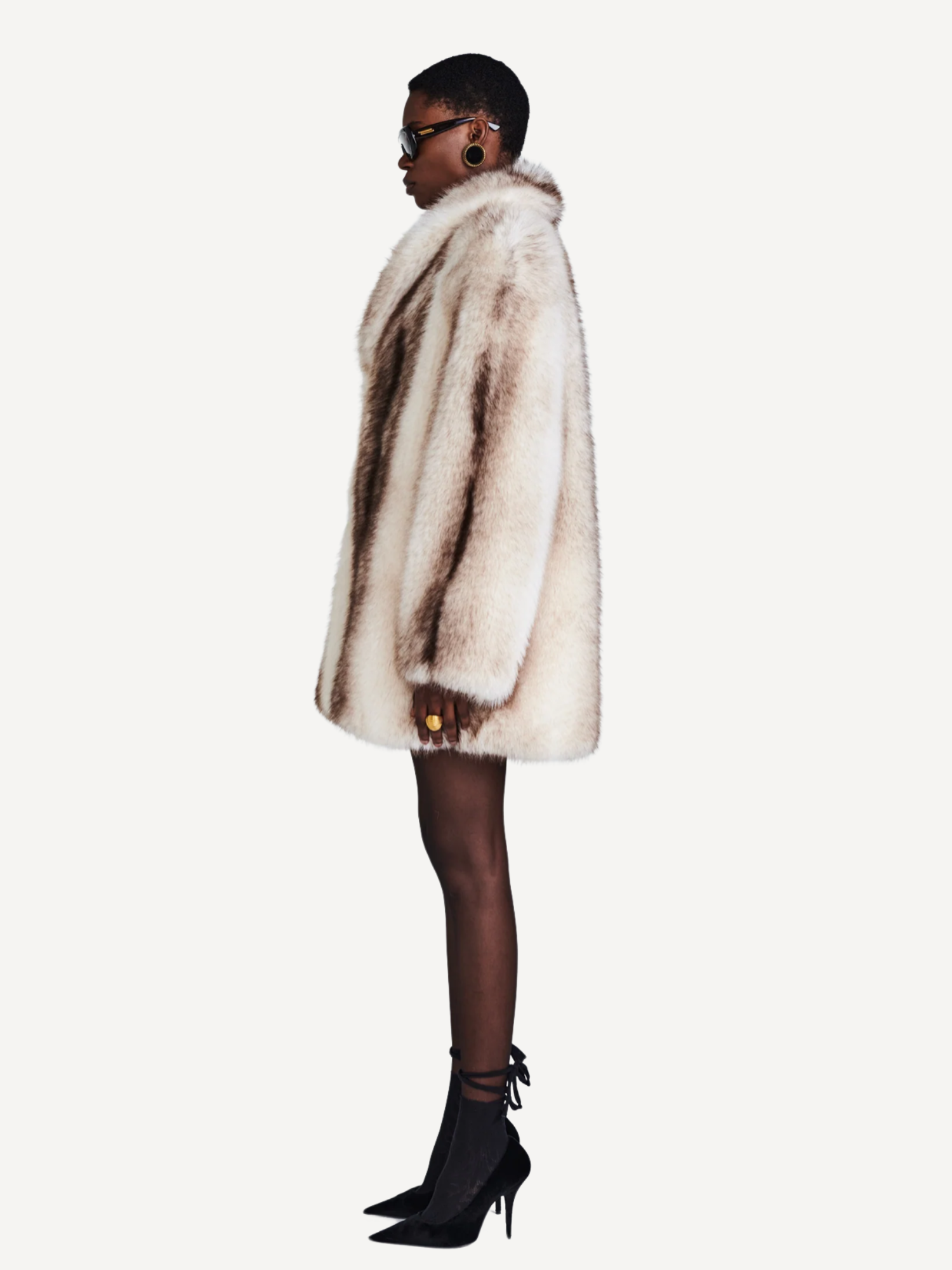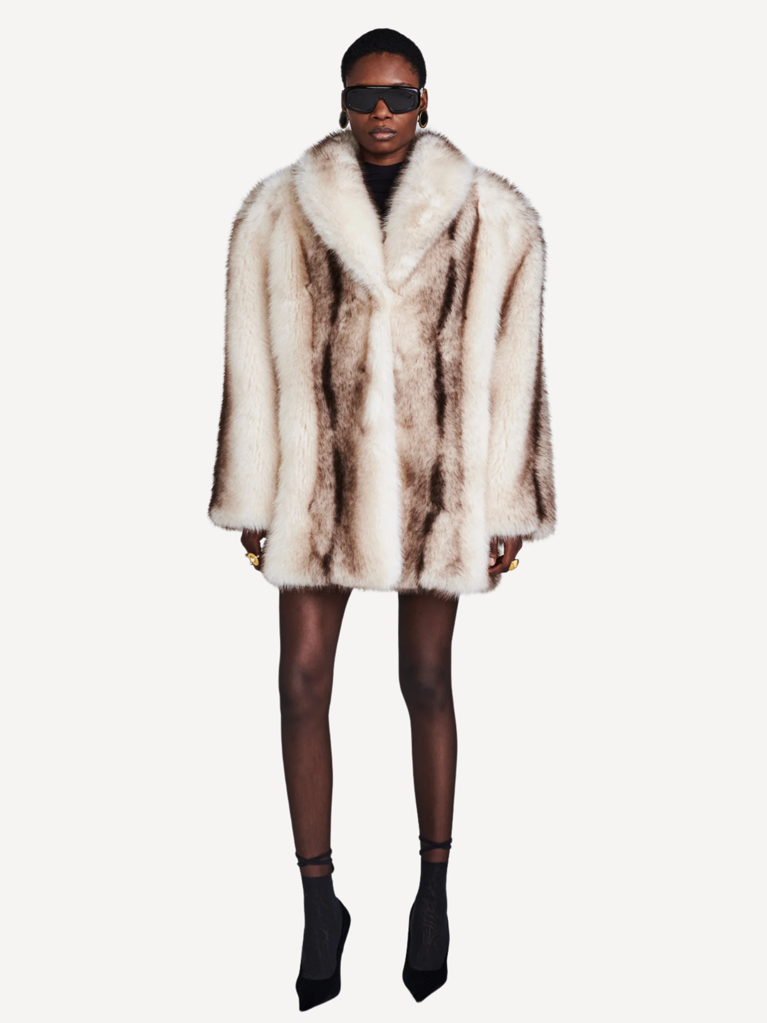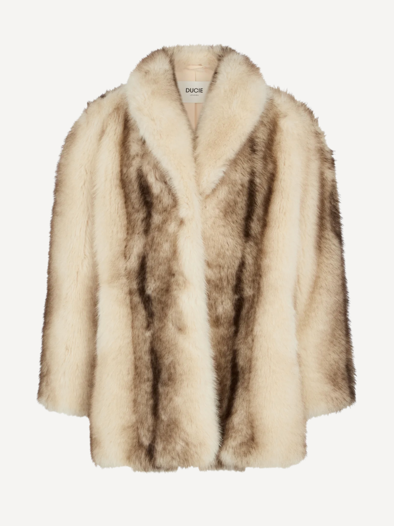 The Emilia jacket stands out with its luxurious faux fur and eye-catching print, making it a true statement piece in any wardrobe. This jacket is designed at hip length and features a sophisticated shawl.