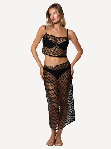 The Pointillee Midi Skirt is crafted from intricate French guipure lace, featuring a flattering midi length and a graceful back slit for ease and movement. Finished with delicate silk-covered buttons along the side, it pairs effortlessly with the Pointillee Bandeau Top for a resort-ready ensemble.