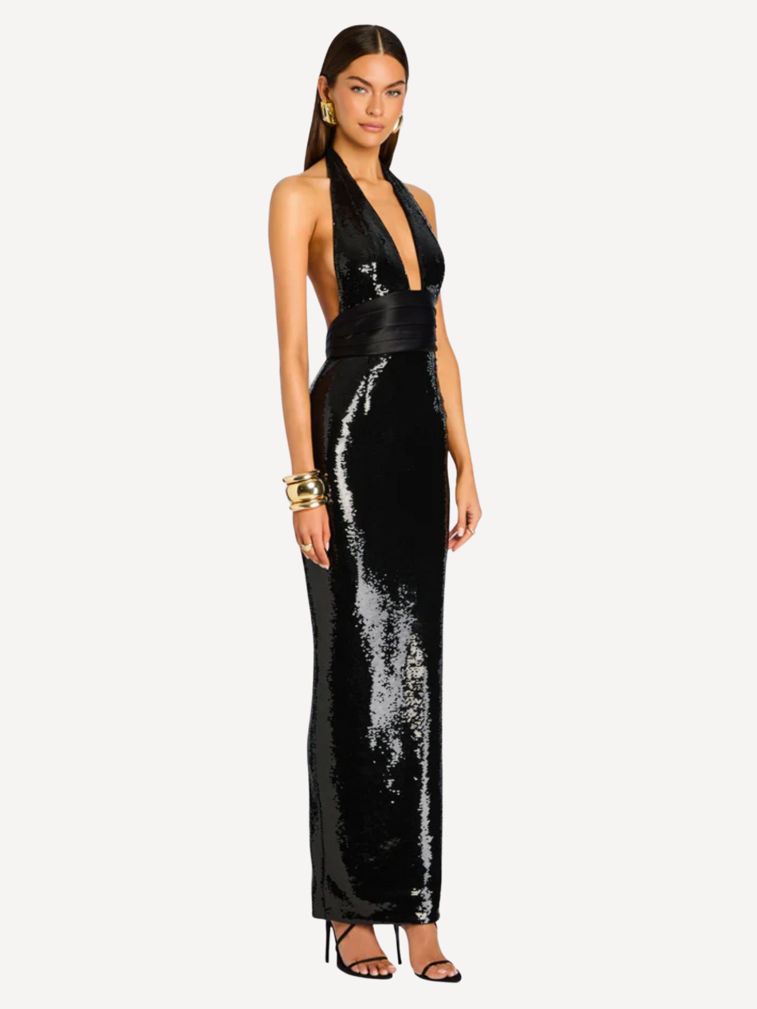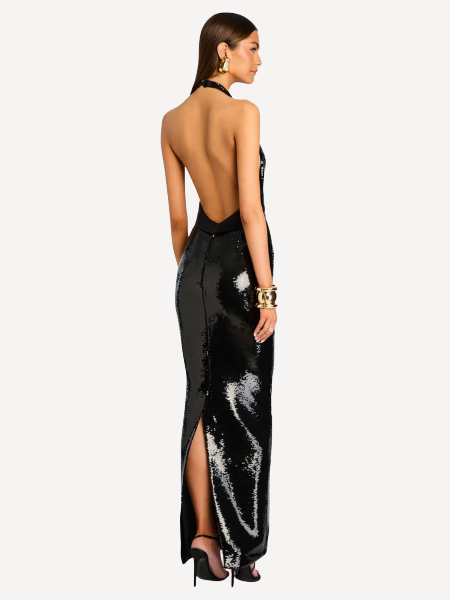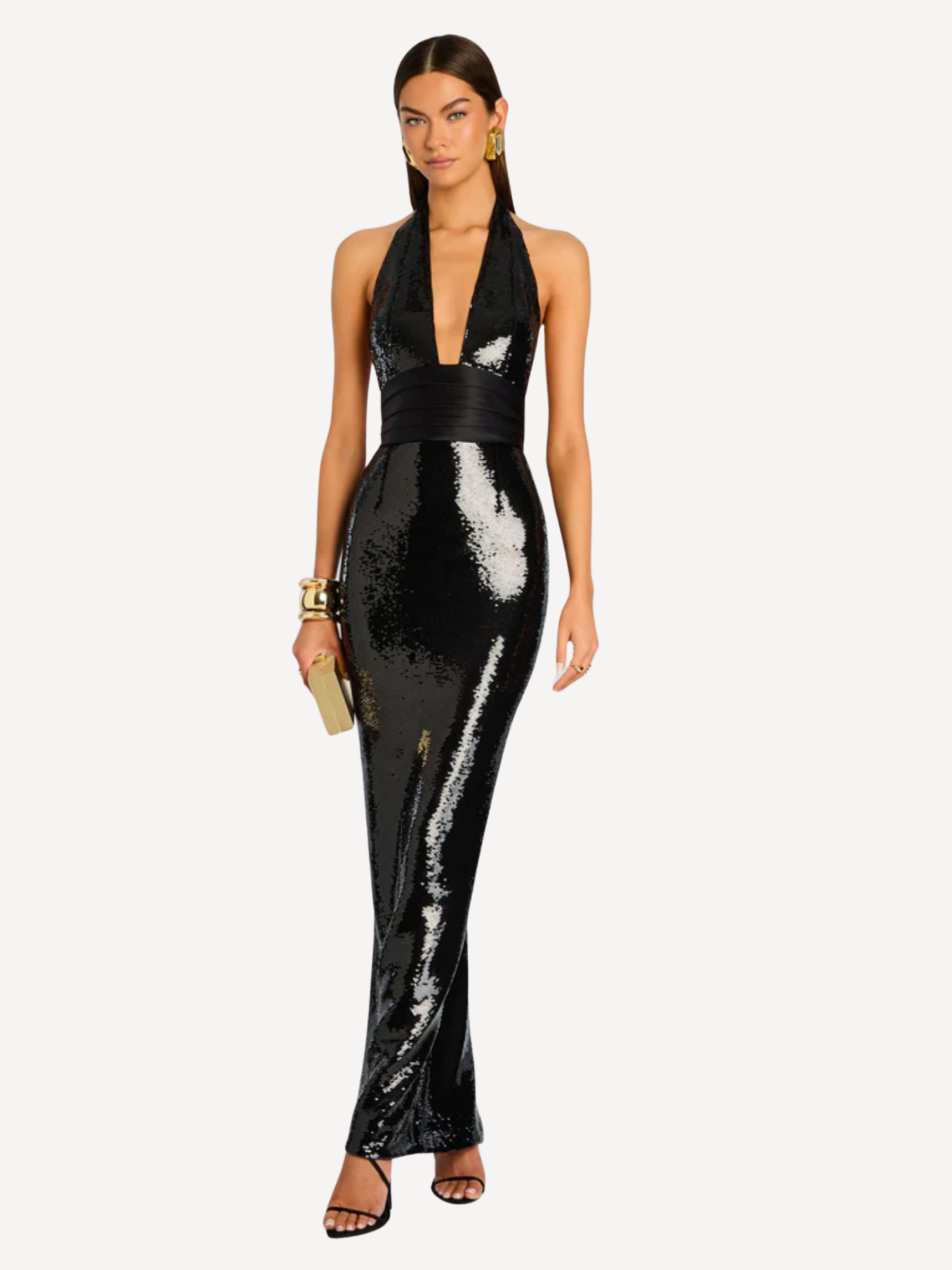 The Kelsie Sequin Dress mixes classic charm with a modern edge. This sleeveless gown features shimmering sequins that catch the light with every move, while the halter neckline creates a statement-making look. Pleating at the waist flatters the silhouette, and an open back adds subtle allure. A back slit allows for graceful movement, making it perfect for evening events. Shown here in Black.
