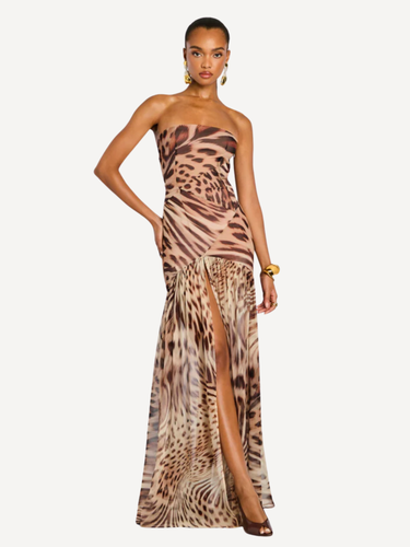 Walk on the wild side with our Nicole Silk Chiffon Dress. This strapless maxi dress features a fierce print with bias-cut, frayed panels throughout the bodice, and a romantic, sheer skirt. A zipper located on the side completes the look. Embrace your adventurous spirit with this captivating dress- crafted to demand attention, this strapless maxi dress boasts a stunning print that exudes fierceness and confidence. Shown here in Animal Print.