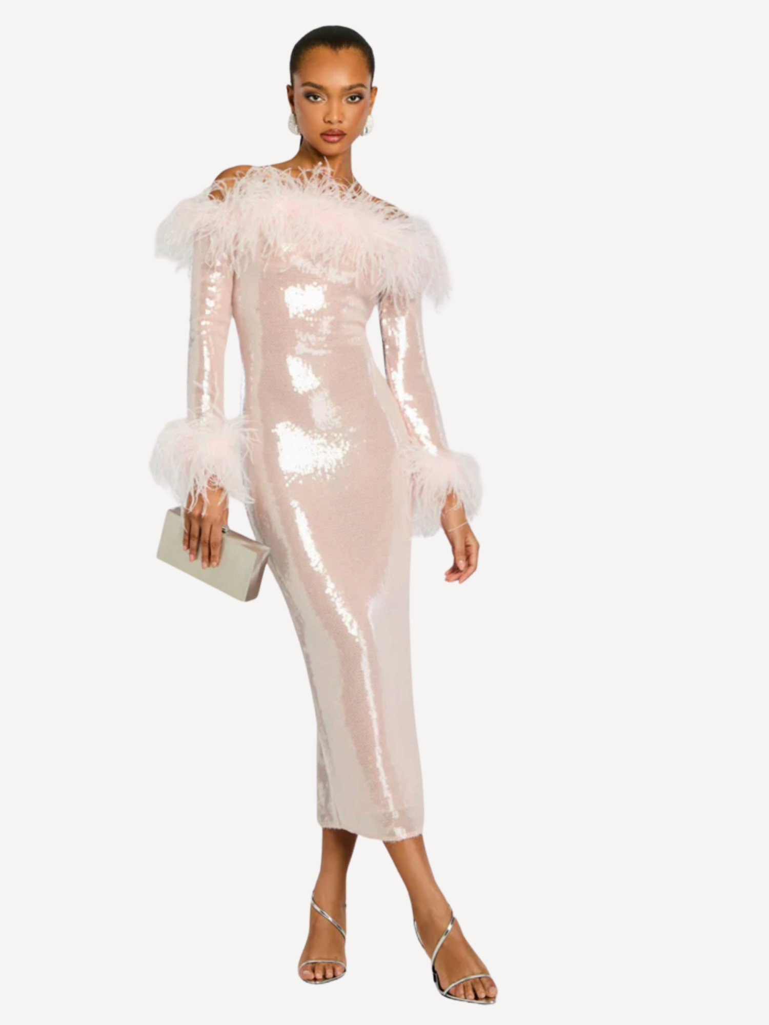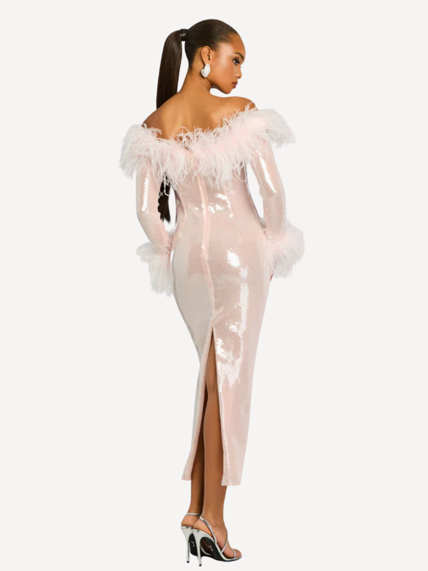 The Petal Dress is a sequin midi dress featuring an off-the-shoulder neckline with allover sequin detailing and delicate feather trim. Finished with a discreet back zipper, it’s designed for cocktail parties, birthday celebrations, and unforgettable evenings. Shown here in Ballet Slipper.