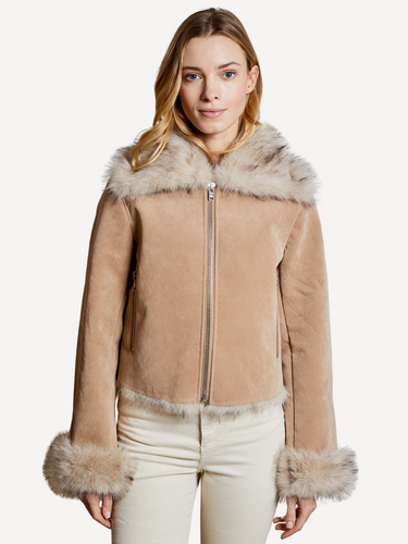 - Exposed faux fur trim at collar and sleeve cuff