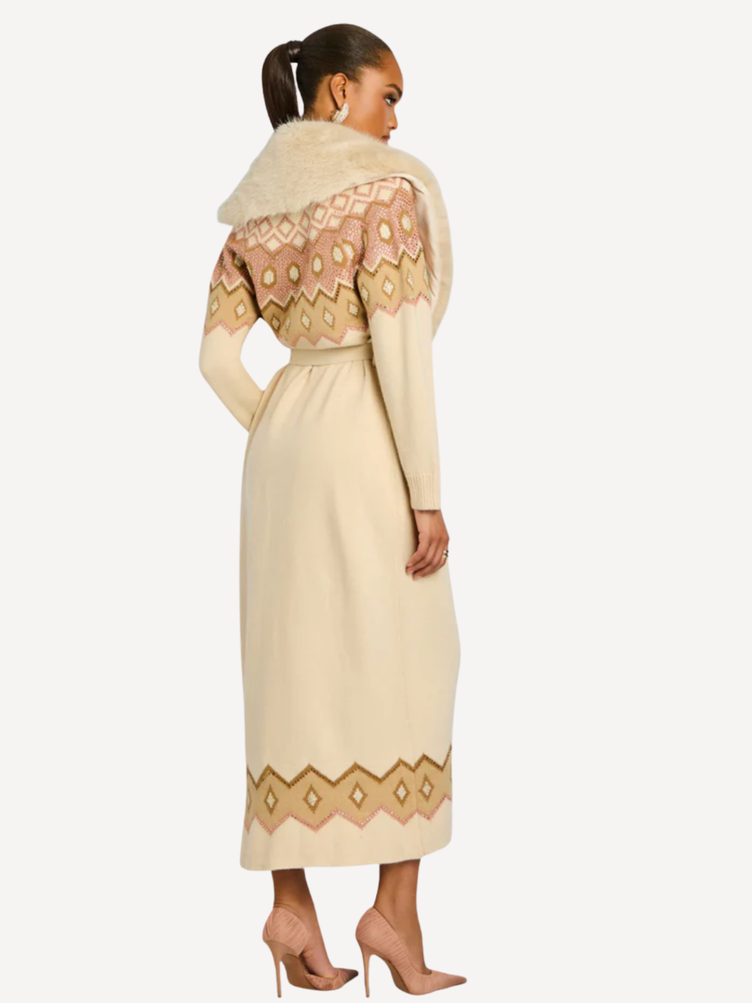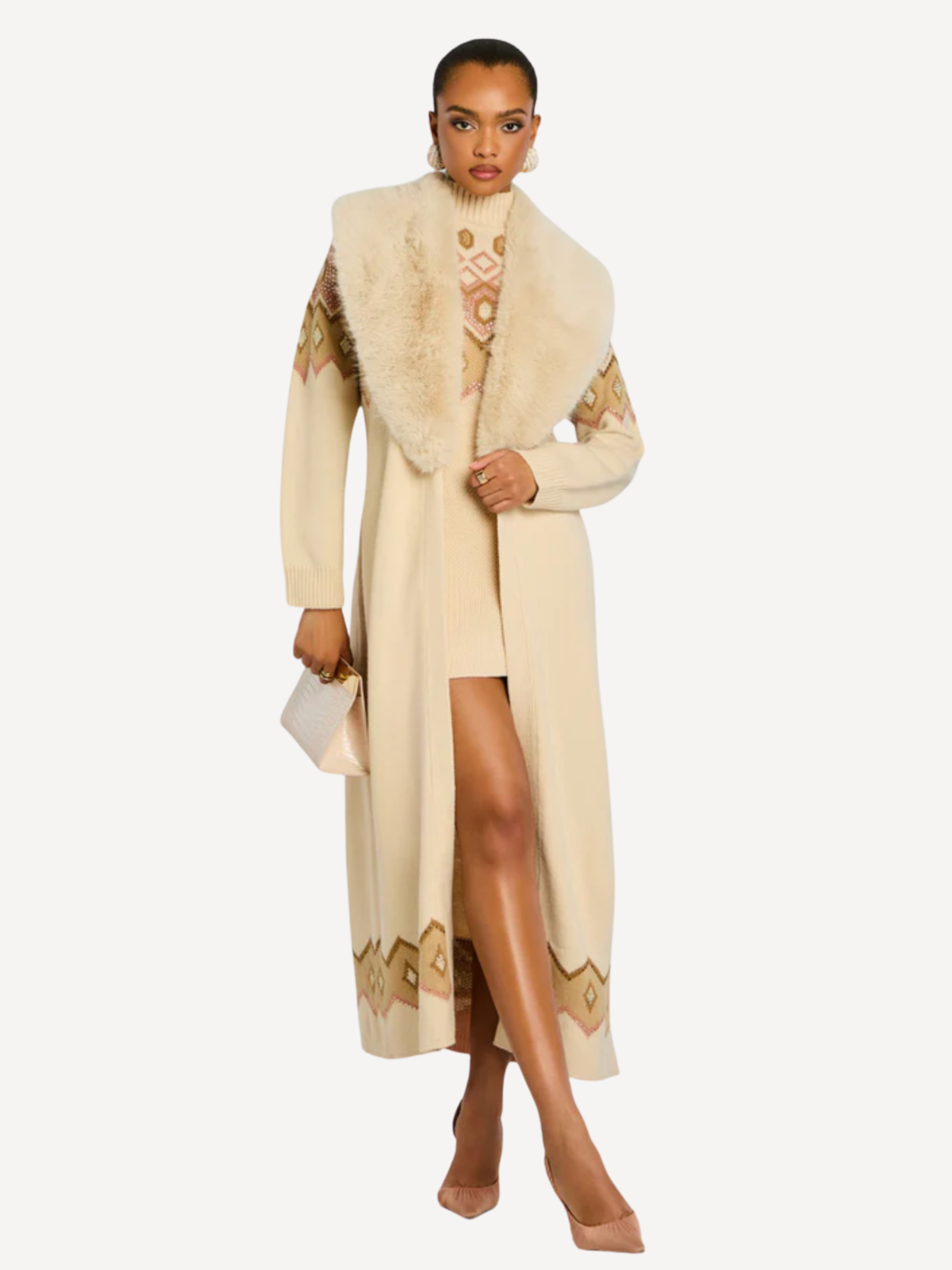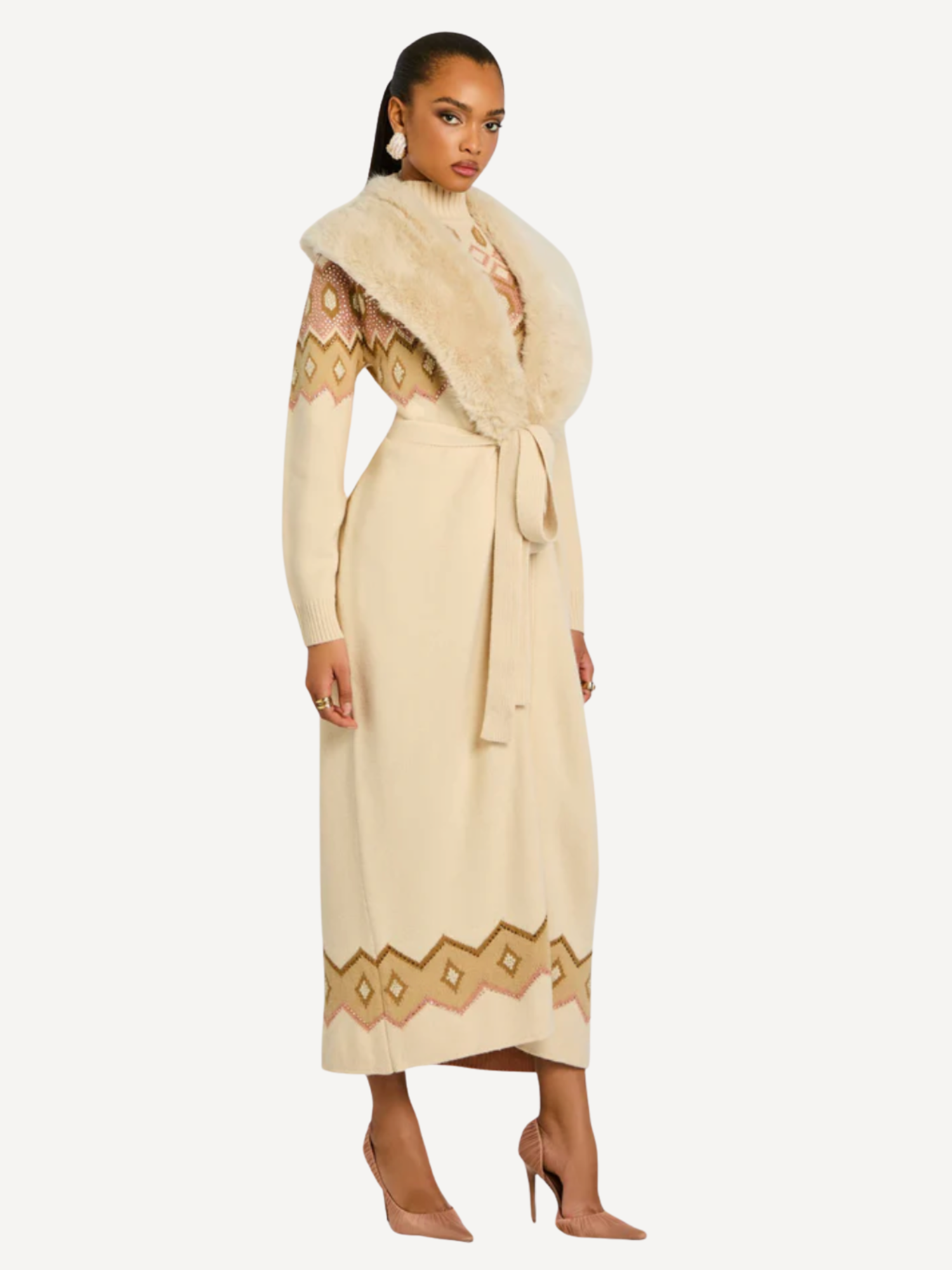 The Basalt Knit Cardigan is a long, luxurious layering piece with fur a trim, designed to transition from après-ski to at-home gatherings. Its neutral tone pairs effortlessly with the Marva Dress, offering refined warmth and timeless sophistication for the season. Shown here in Vintage Rose/Swan Mult.
