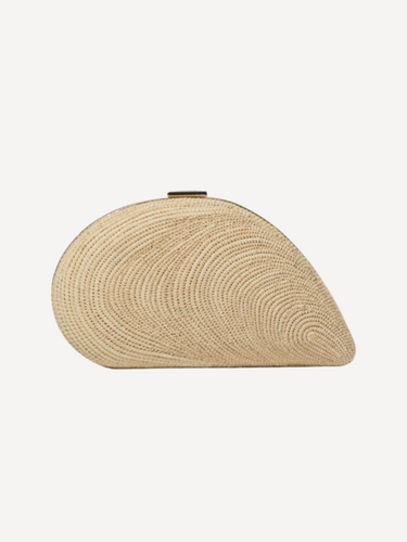 A snap-top clutch in an inspired shell shape with a textured raffia exterior and chunky detachable chain strap.