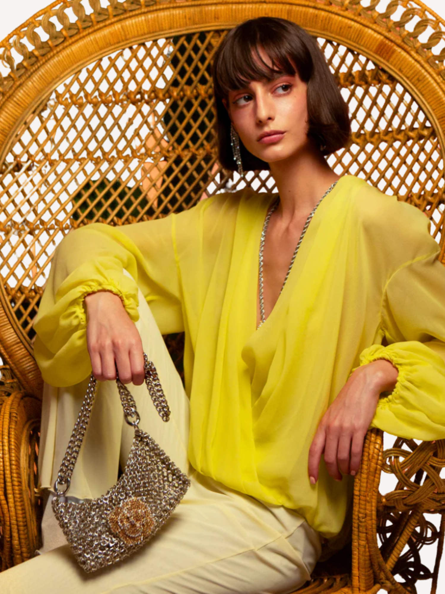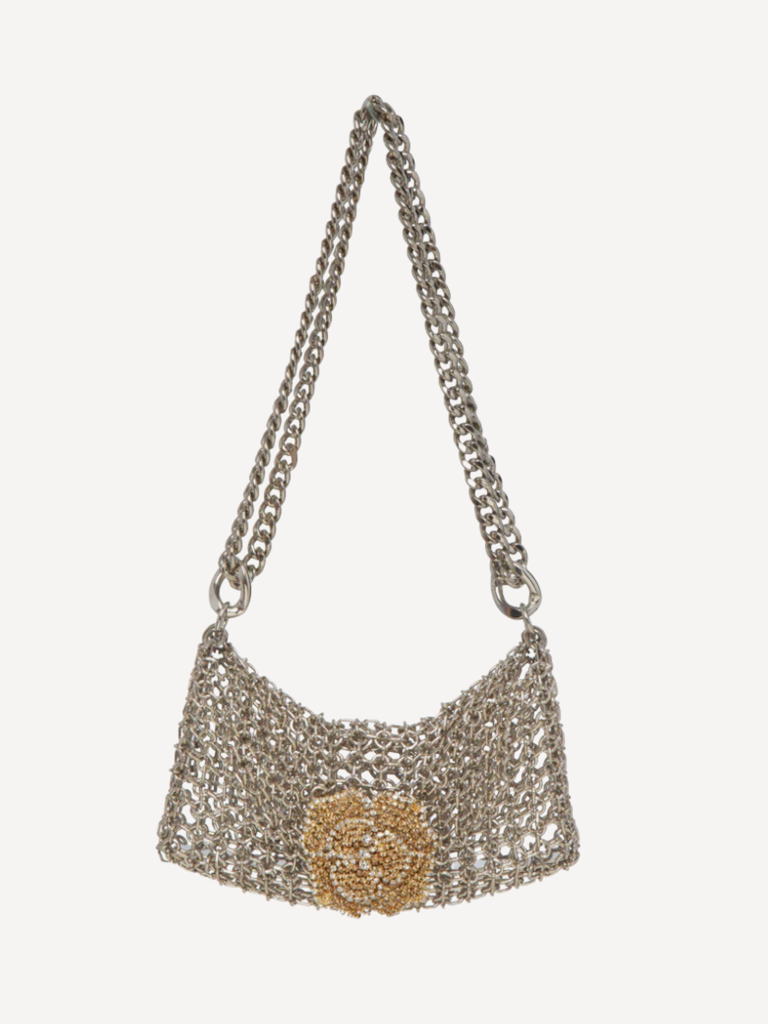 Brass plated with 24k gold or 925 silver powder. Hand- woven metal mesh. Crystal flower buckle with internal closure.
