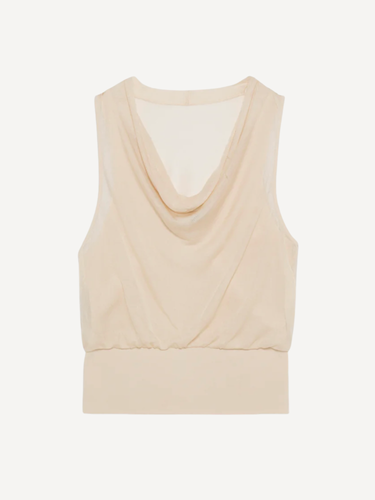 The Carmina Knit Tank in Sand. Designed with sheer combo knitwear, this cowl tank offers a fluid drape and a modern finish.