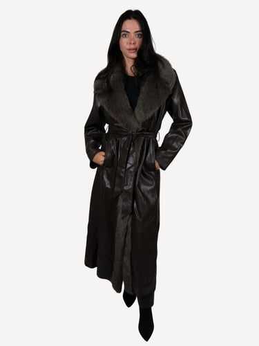 Timeless, cruelty-free, and seriously chic. This faux leather trench coat is where luxury meets conscience. Cut in a sleek longline silhouette with a stunning rich chocolate tone, it’s topped with a dramatic faux fur shawl collar that feels as indulgent as it looks. A self-tie belt cinches the waist to elevate your silhouette, making it as flattering as it is warm.