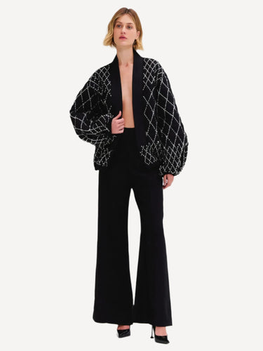 Crafted from a crinkle lurex material, this jacket features crystal beading in cross pattern on the front of the jacket and throughout the sleeves. The jacket has two functional side pockets.