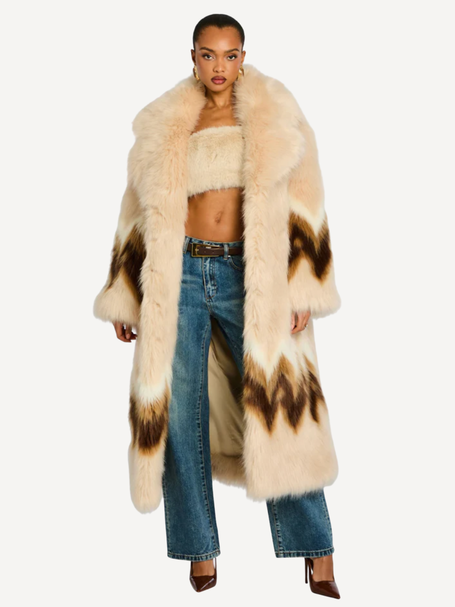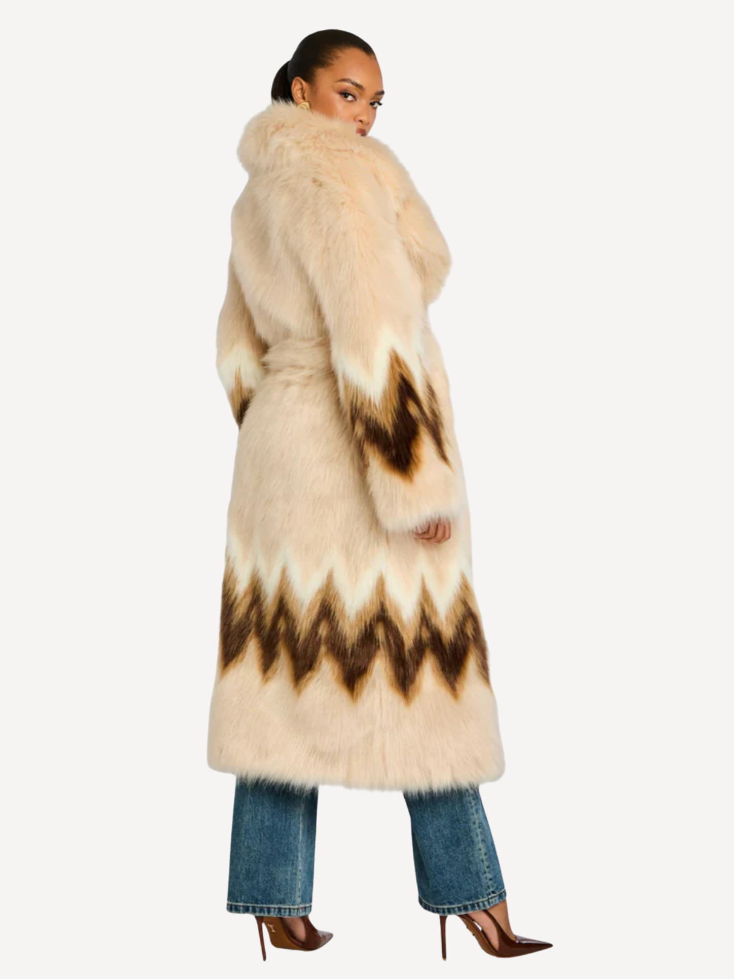 The Magali Faux Fur Coat is a luxurious chevron-print faux fur coat with a belted waist. Designed for ski lodge glamour and winter gatherings, it transitions from après-ski soirées to formal evening events. Shown here in Multi.