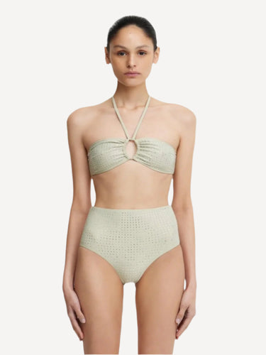 Ideal for those who love a touch of sparkle, the Nah Top in Moss features rhinestone accents paired with a sleek halter design. The adjustable gathered bust and silver clasp bring a polished finish, making it a must-have for your vacation wardrobe. Island nights spent at a beachside bar - this bikini is a must have.- Halter top
