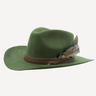 100% handmade hat with a top shape with a raised wool brim, olive color, surrounded by strips of skin and rooster, turkey and guinea fowl feathers.