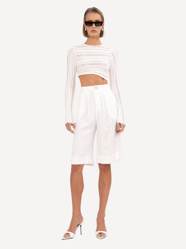 The Rosaline Crop is a modern take on elevated essentials. Designed with an asymmetrical neckline and long sleeve silhouette, it’s cut from our newest knit. The unique shape adds a sculptural edge, making it the kind of piece that instantly elevates any outfit. Whether paired with relaxed denim, tailored trousers, or a minimal mini, the Rosaline is the statement for your summer wardrobe.