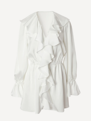 This pull-on mini dress features ruffles at the v-neckline and sleeves. It’s made of silky charmeuse fabric with encased elastic at the waist for a cinched look.