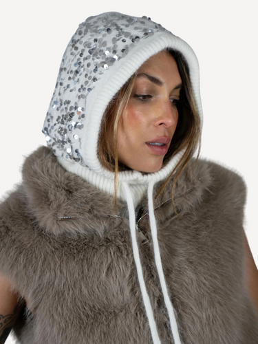 Where luxe warmth meets winter sparkle. The Sequin Knit Hood is crafted from an ultra-soft blend of angora and cashmere for unmatched comfort, then hand-finished with shimmering sequins that catch the light with every movement. Designed to be worn like a snood, this one-size style pulls over the head for a snug, face-framing fit.