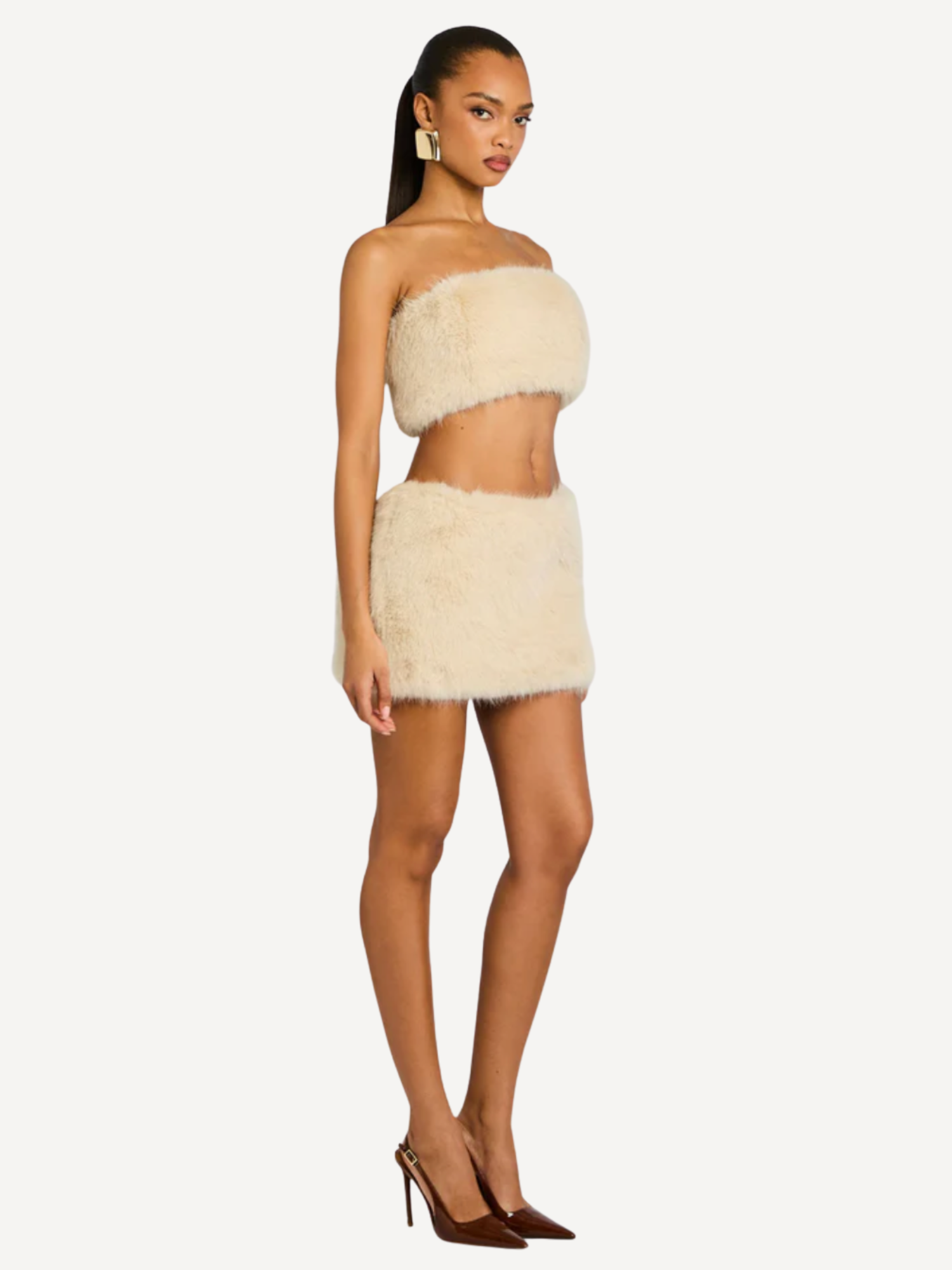 The Vada Bandeau Top features a plush faux-fur texture with a sleek side zip closure. Designed for après-ski styling, it layers effortlessly under the Magali Coat or pairs with the Minerva Skirt for a polished look from lodge to evening. Shown here in Chai.