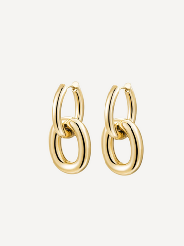 Noa's gorgeous day to night earrings featuring a removable oval golden drop for a 2 in 1 look. Wear with the golden oval drop for a stunning statement look or without for an everyday gorgeous gold hoops.The Golden Oval Cascade earrings are a symphony of timeless elegance and modern luxury. Featuring interlocking oval links bathed in radiant gold, these statement earrings exude effortless sophistication.